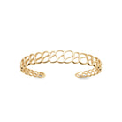 Sa structure ajourée crée un jeu de lumière subtil sur la peau, évoquant une dentelle dorée qui se pose avec délicatesse autour du poignet.