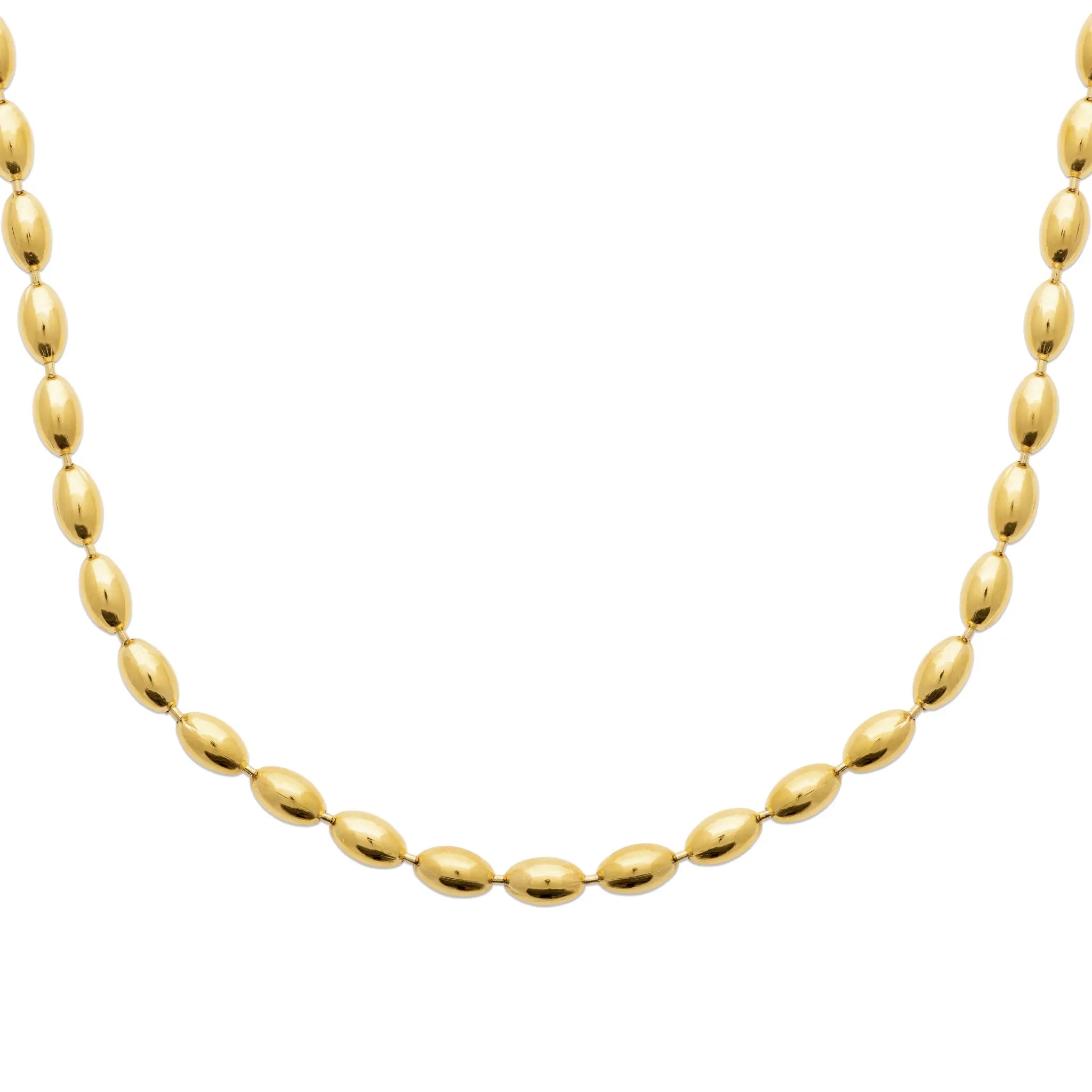 Ce collier est une ode à la fluidité. Il se compose d'une succession infinie de petits maillons ovoïdes, évoquant la forme délicate de grains de riz ou de perles métalliques étirées. Contrairement à une chaîne plate et rigide, cette structure possède un volume "roulant". Chaque grain, poli à l'extrême grâce à notre finition PVD or, capture la lumière sur sa courbe pour la renvoyer avec une douceur diffuse. Au toucher, c'est une sensation onctueuse, presque soyeuse. Le métal semble liquide, épousant le moindre mouvement de votre cou sans jamais se figer.