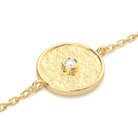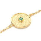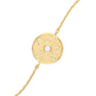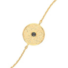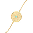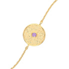 Son médaillon rond à la texture martelée délicate, inspirée des reflets du soleil sur le métal, abrite en son centre une pierre fine de 2 mm, sertie à la main.