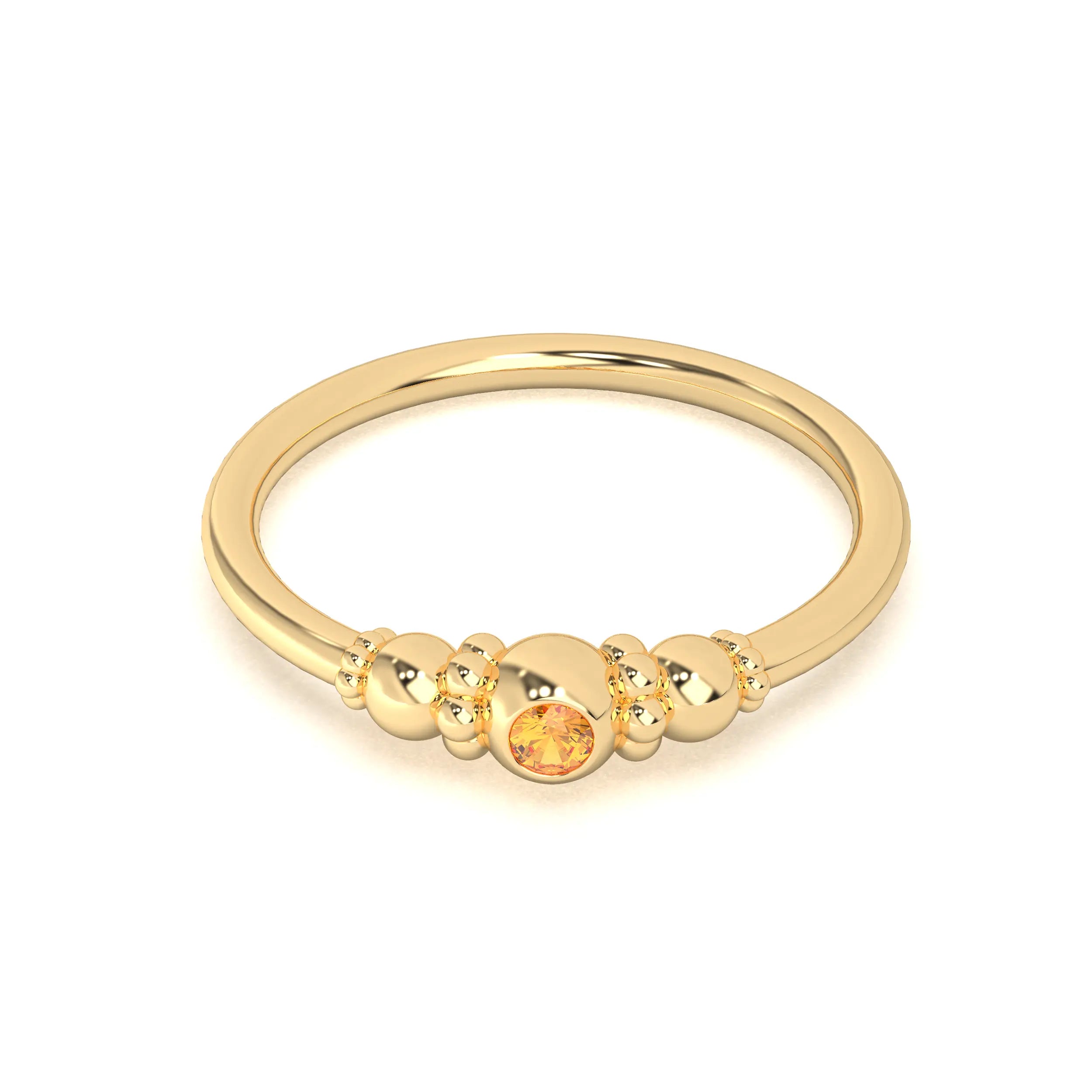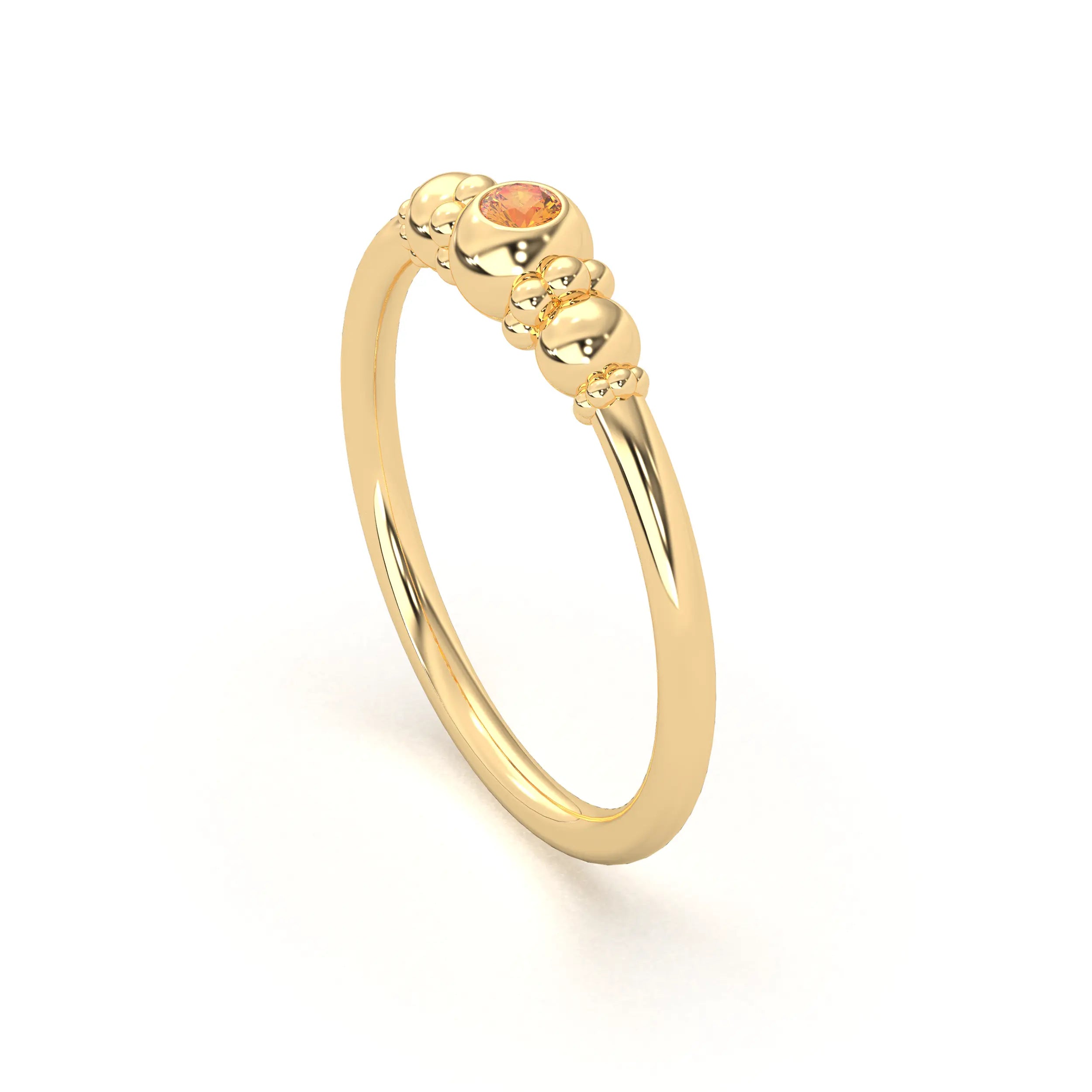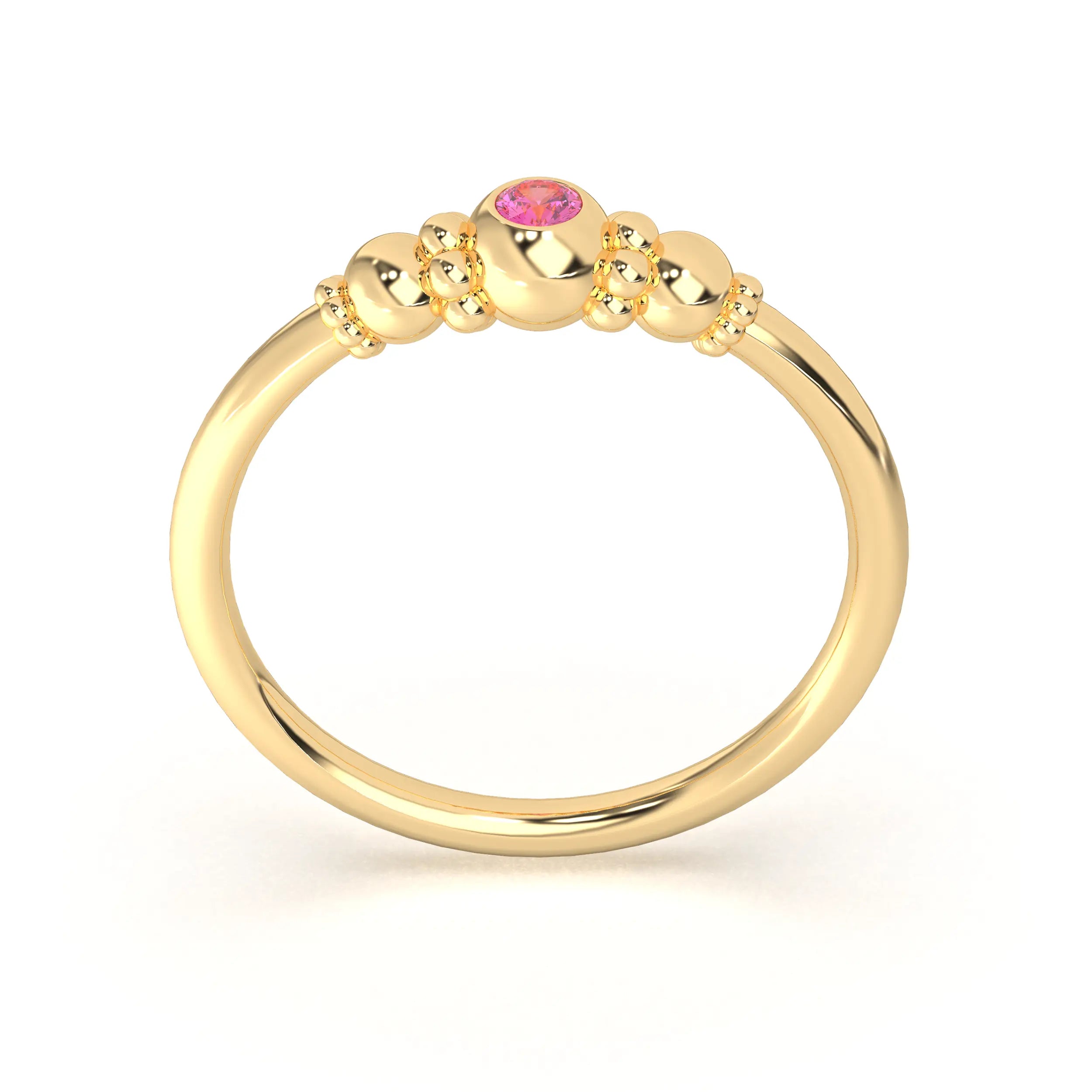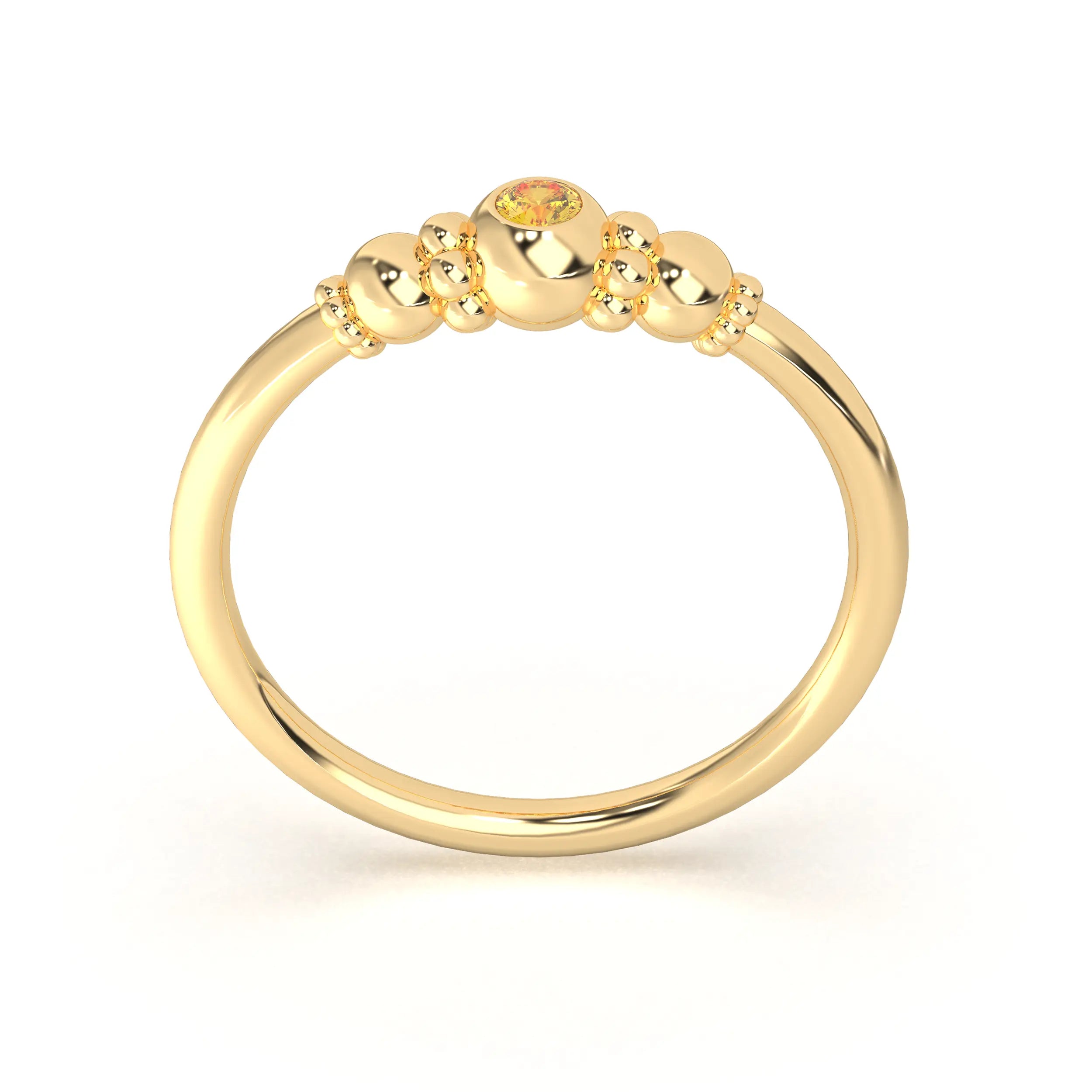 Découvrez cette magnifique bague en or jaune 18 carats, ornée d'une pierre précieuse de 2,4 mm, disponible selon votre choix. Le design délicat et unique est sublimé par de petites sphères dorées qui entourent la pierre, ajoutant une touche de raffinement et un aspect légèrement bohème.