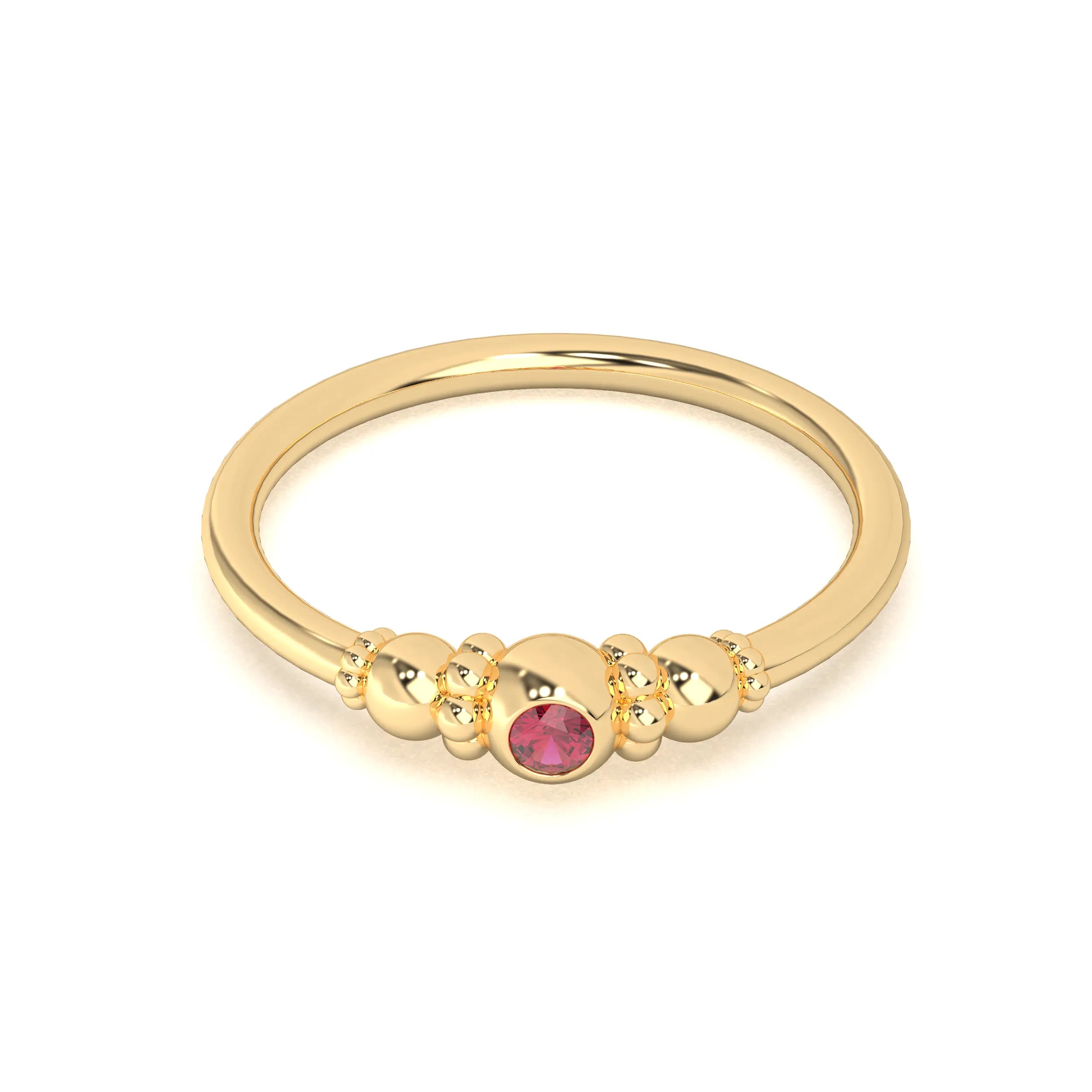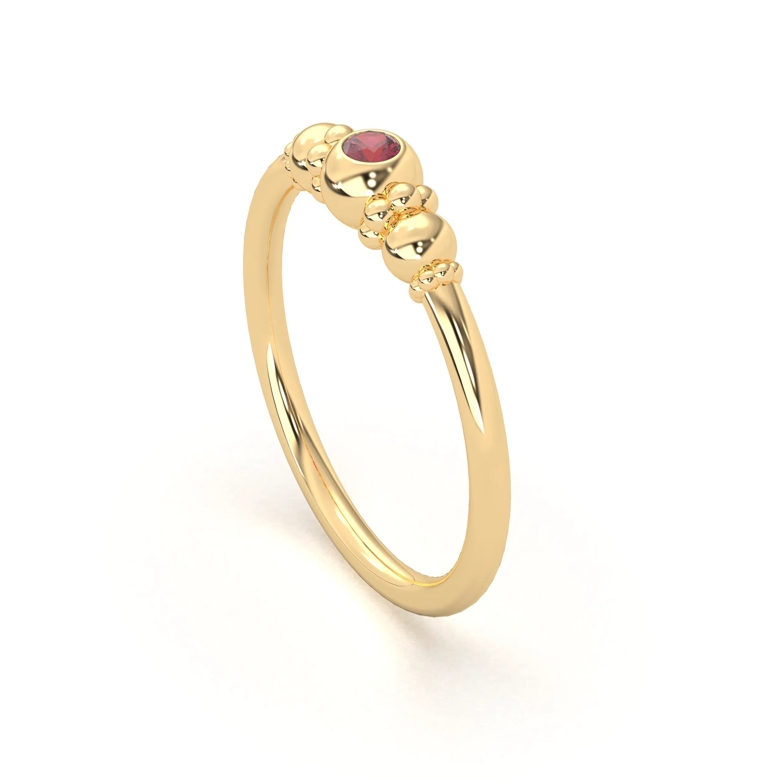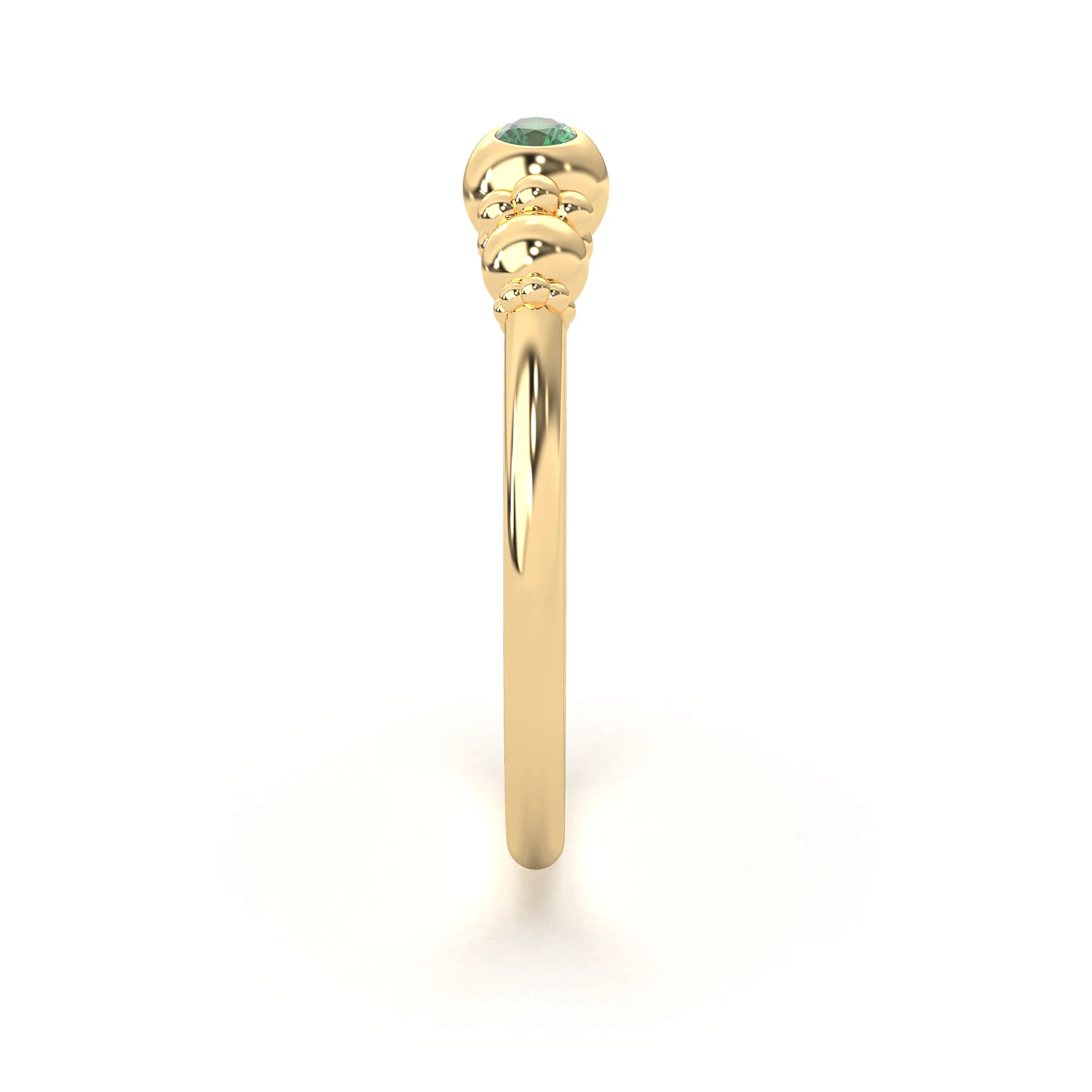 Découvrez cette magnifique bague en or jaune 18 carats, ornée d'une pierre précieuse de 2,4 mm, disponible selon votre choix. Le design délicat et unique est sublimé par de petites sphères dorées qui entourent la pierre, ajoutant une touche de raffinement et un aspect légèrement bohème.