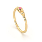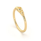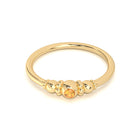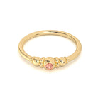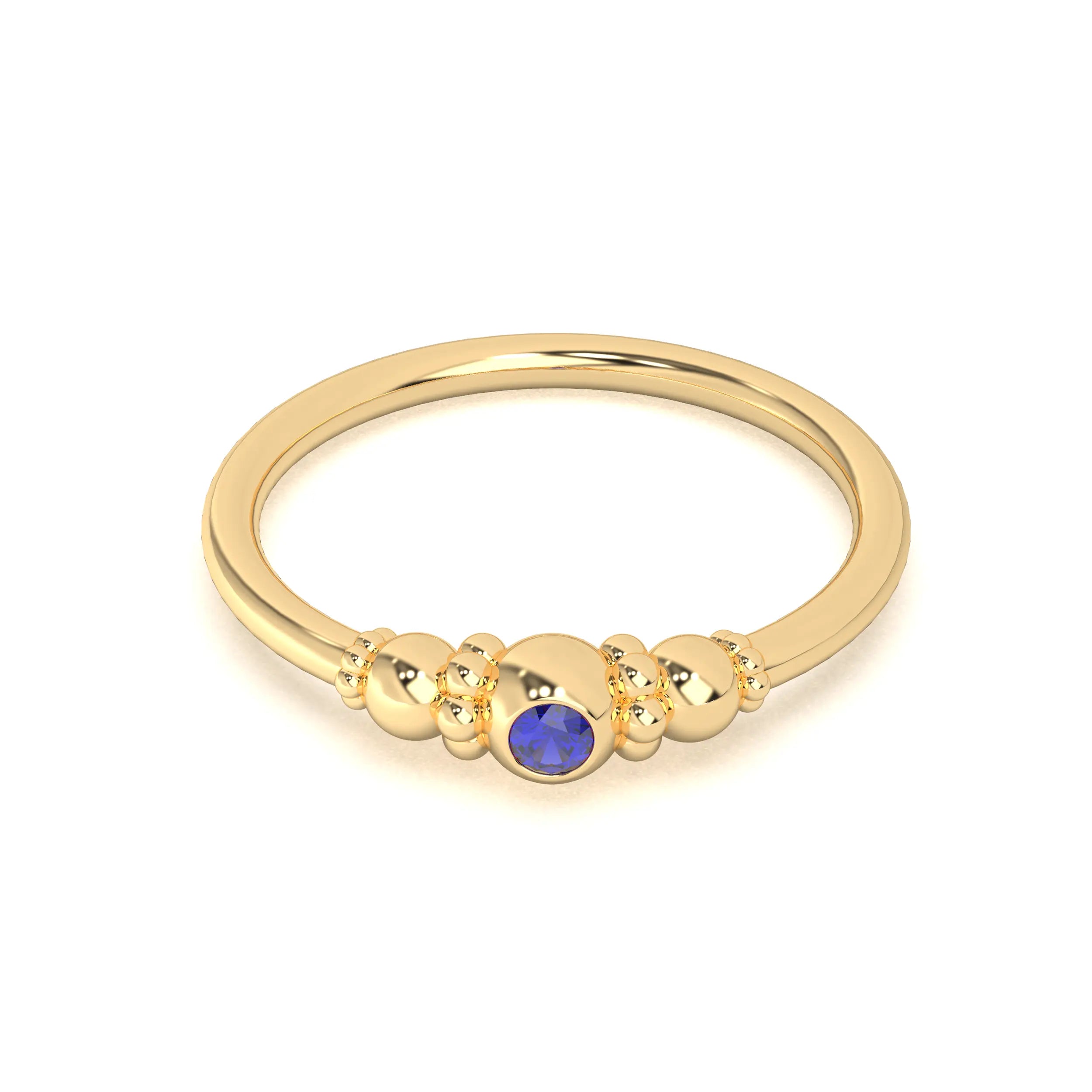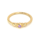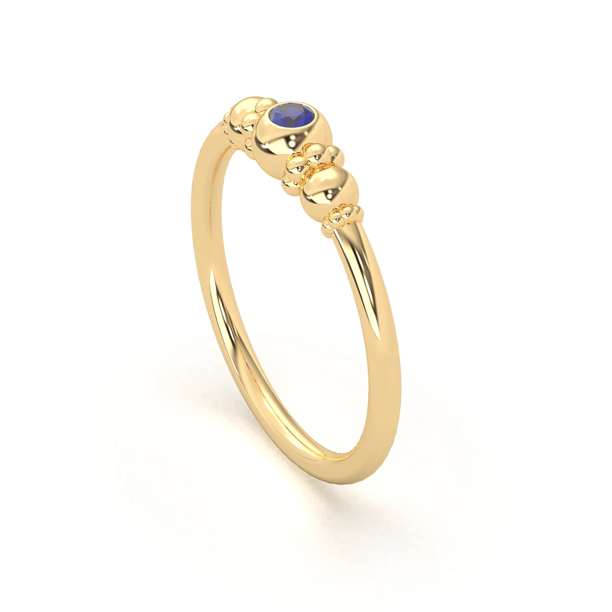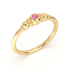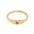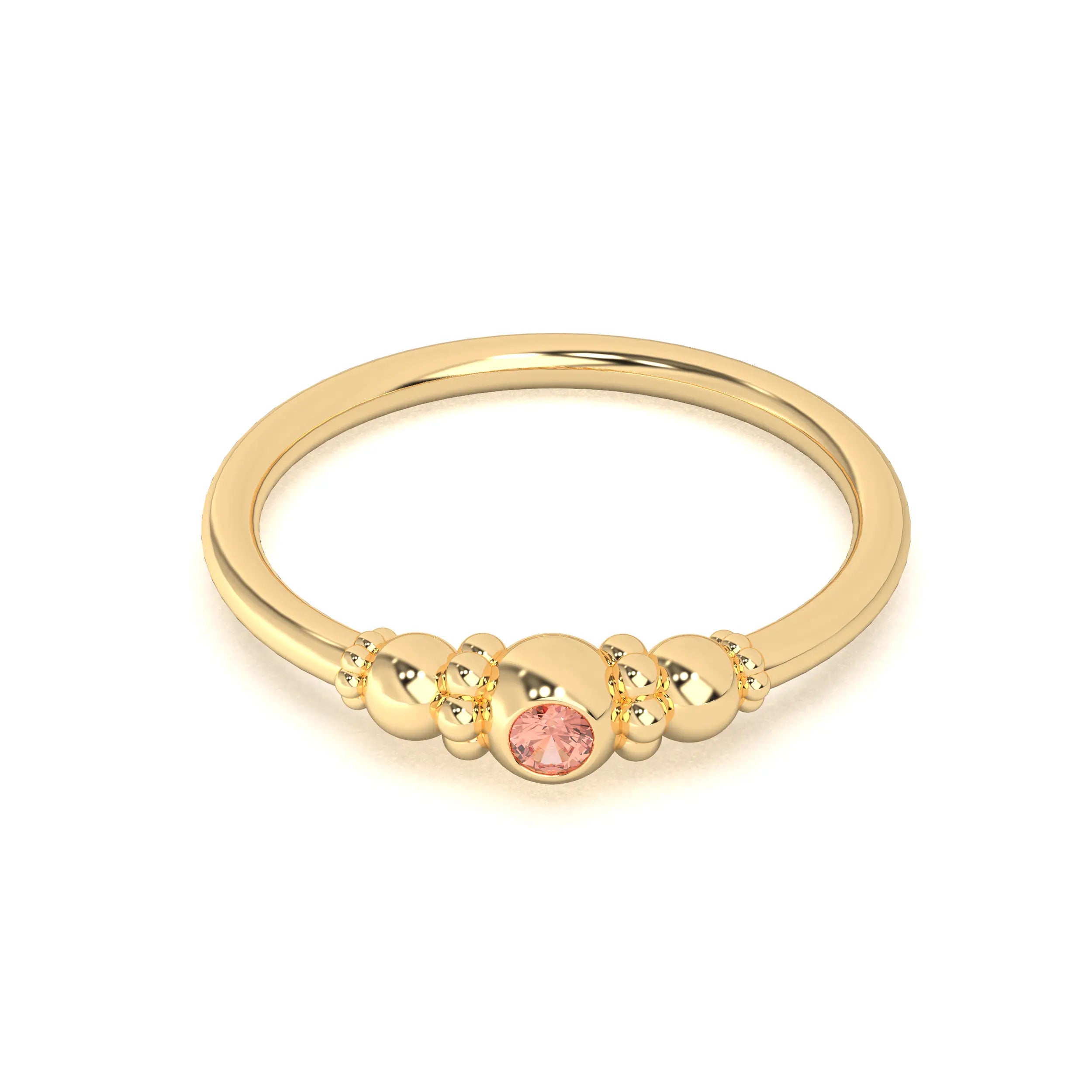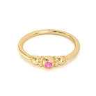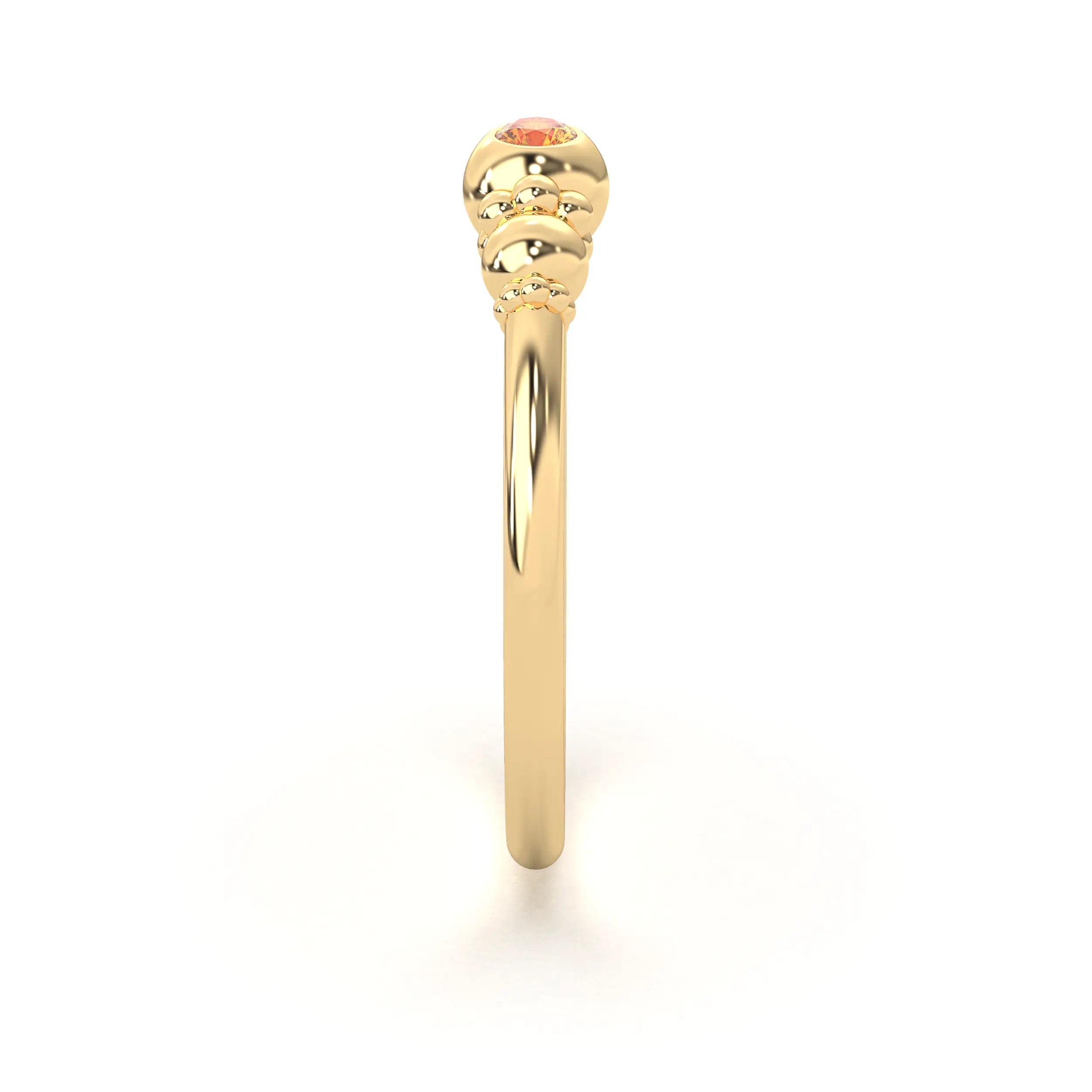 Découvrez cette magnifique bague en or jaune 18 carats, ornée d'une pierre précieuse de 2,4 mm, disponible selon votre choix. Le design délicat et unique est sublimé par de petites sphères dorées qui entourent la pierre, ajoutant une touche de raffinement et un aspect légèrement bohème.