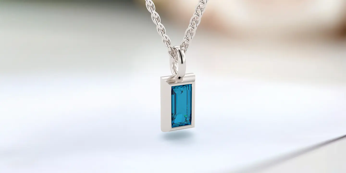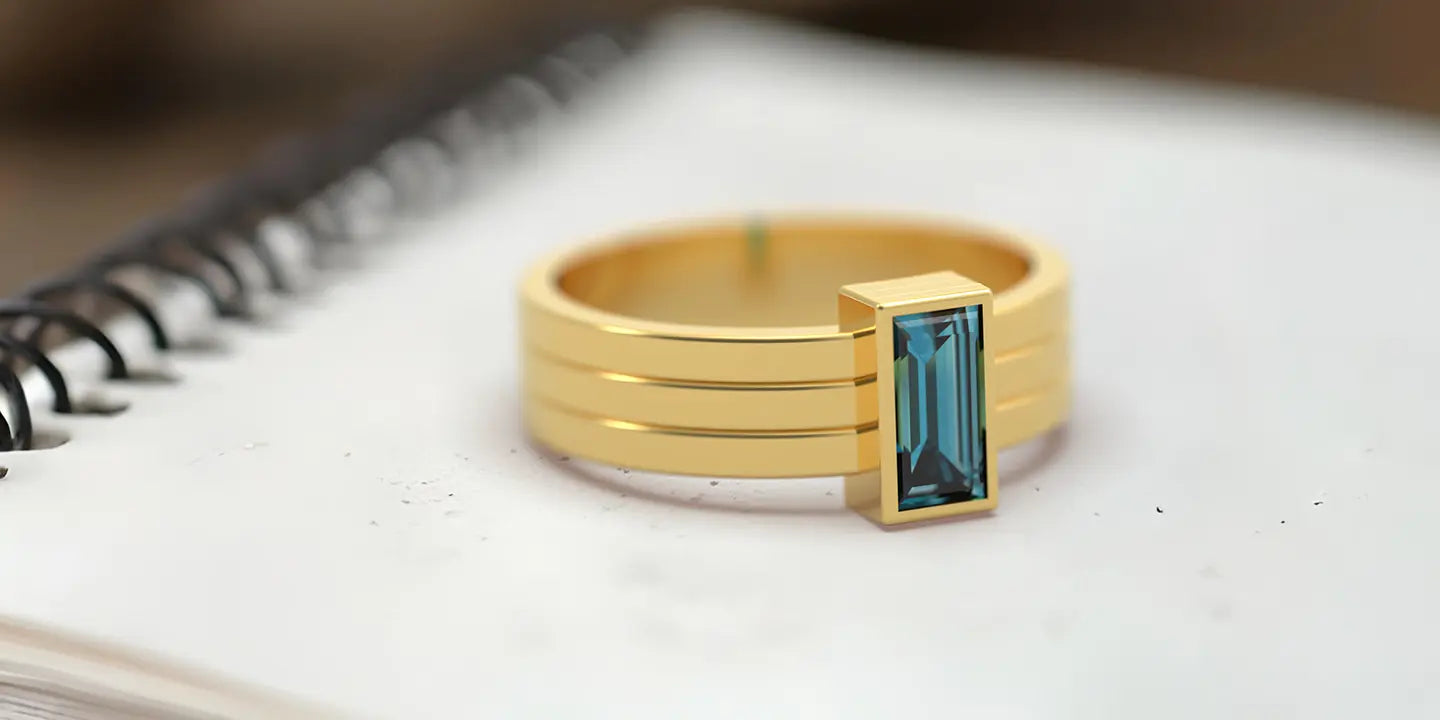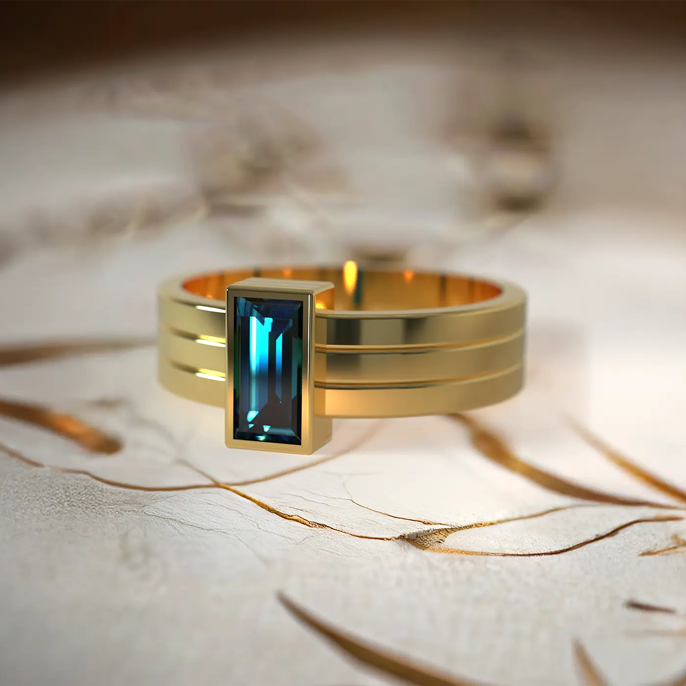 Avec sa taille baguette résolument vintage, la pierre confère un caractère affirmé à ce bijou.
