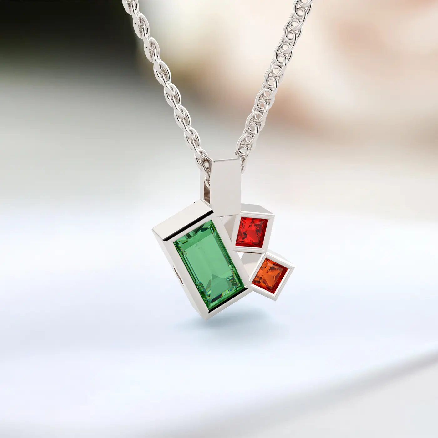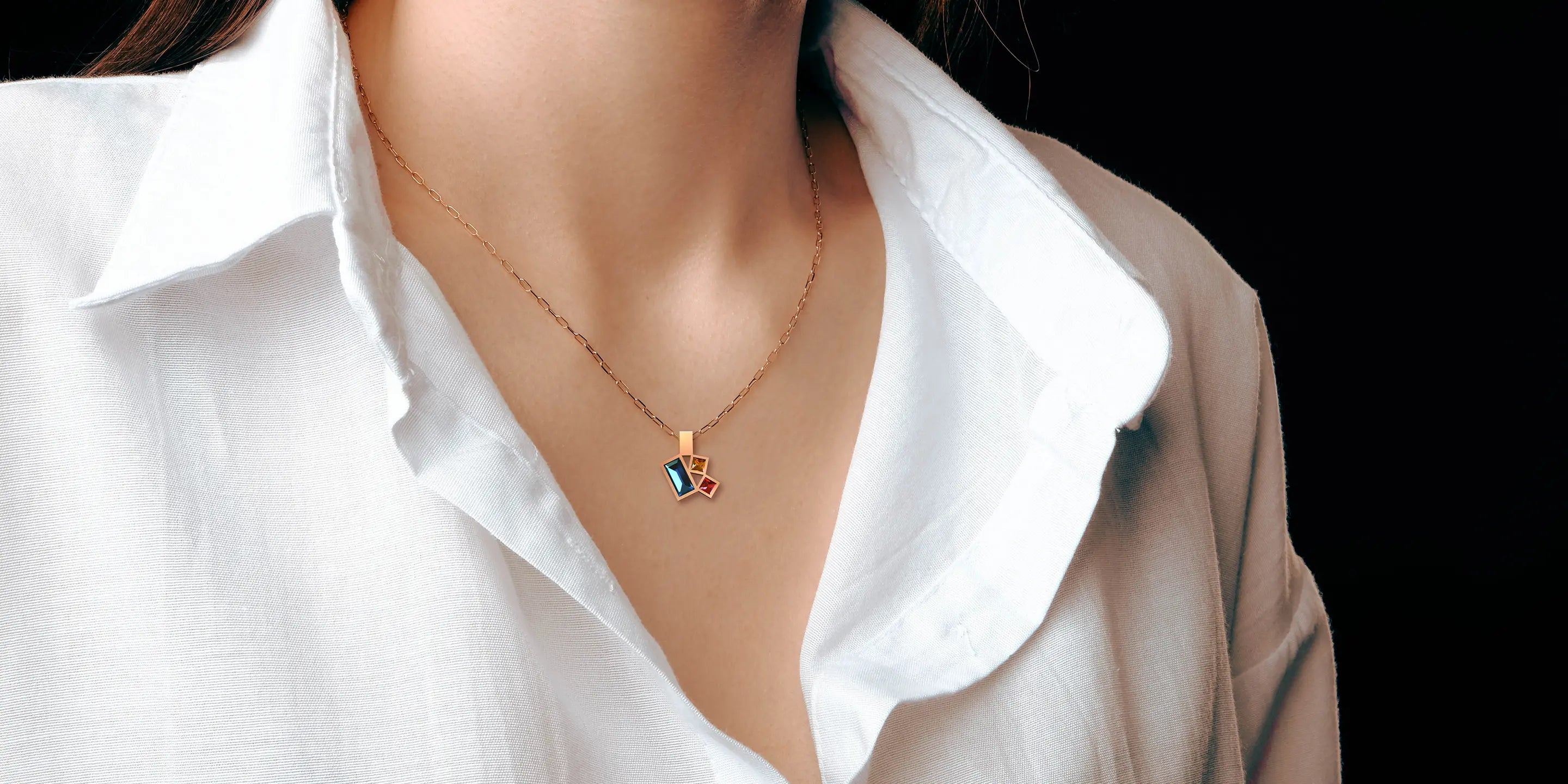 Ce collier révèle un jeu subtil de lumière et de volume, rehaussé par trois pierres fines