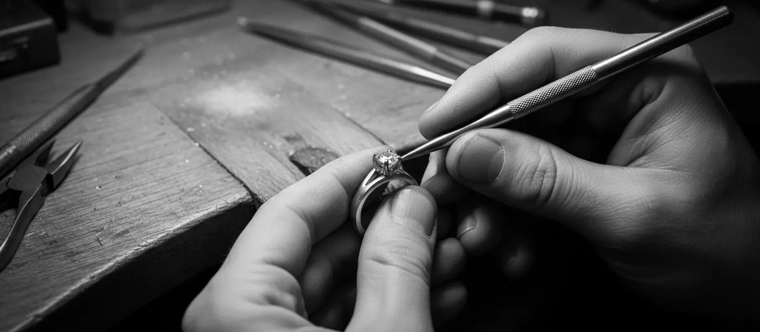 Votre pièce est conçue et fabriquée à la main par Baptiste : fonte et mise en forme du métal, laminage, texturage, polissage, préparation du serti et sertissage par partenaires spécialisés. Chaque bijou passe par des contrôles qualité exigeants, du respect des cotes à la finition. Résultat : des alliances, bagues, pendentifs et bracelets durables, confortables et lumineux, signés Bajoia.
