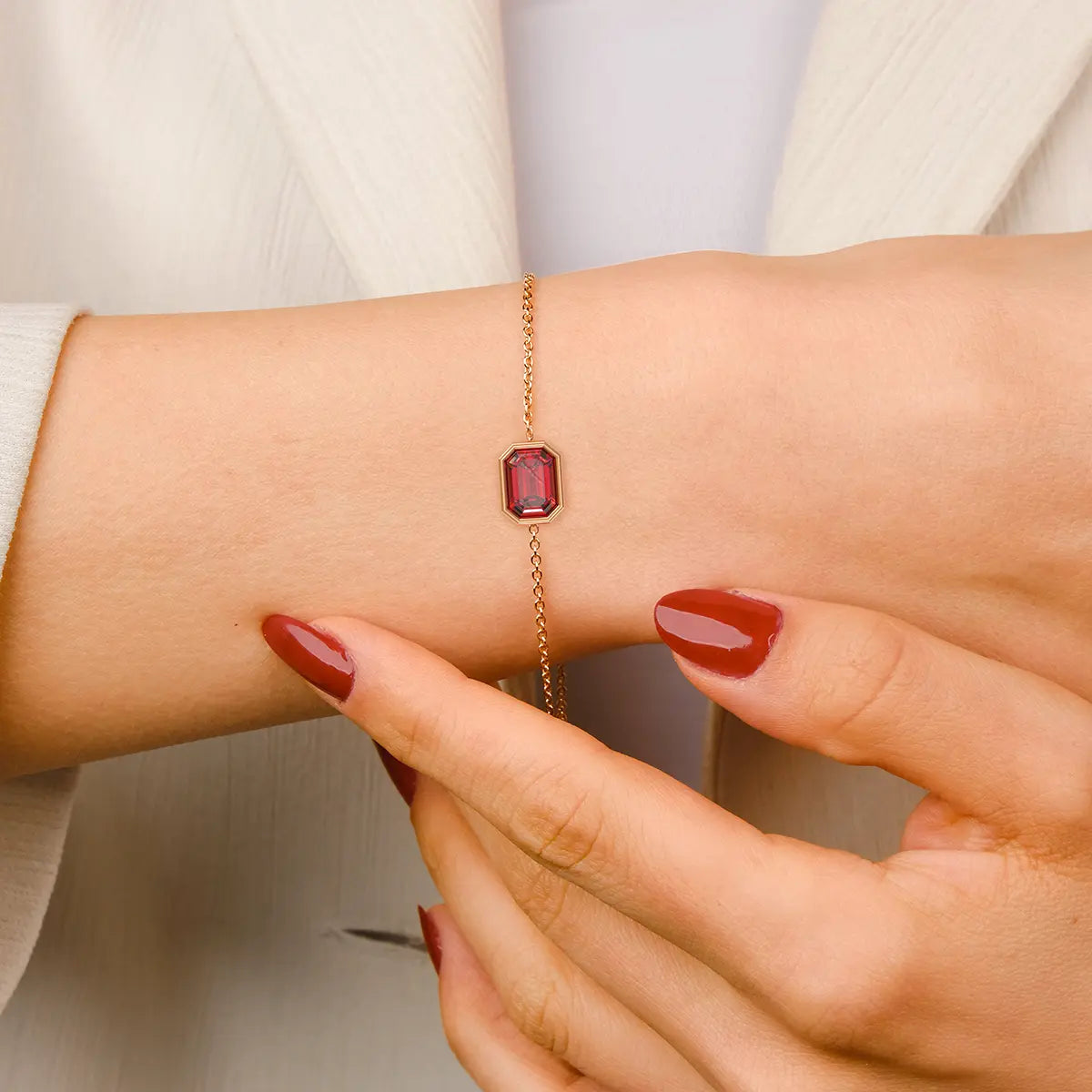 Bracelet Byzance en or rose 18 carats orné d’une pierre fine semi-précieuse rectangle (taille émeraude avec pans coupés) de 7 x 5mm au choix.